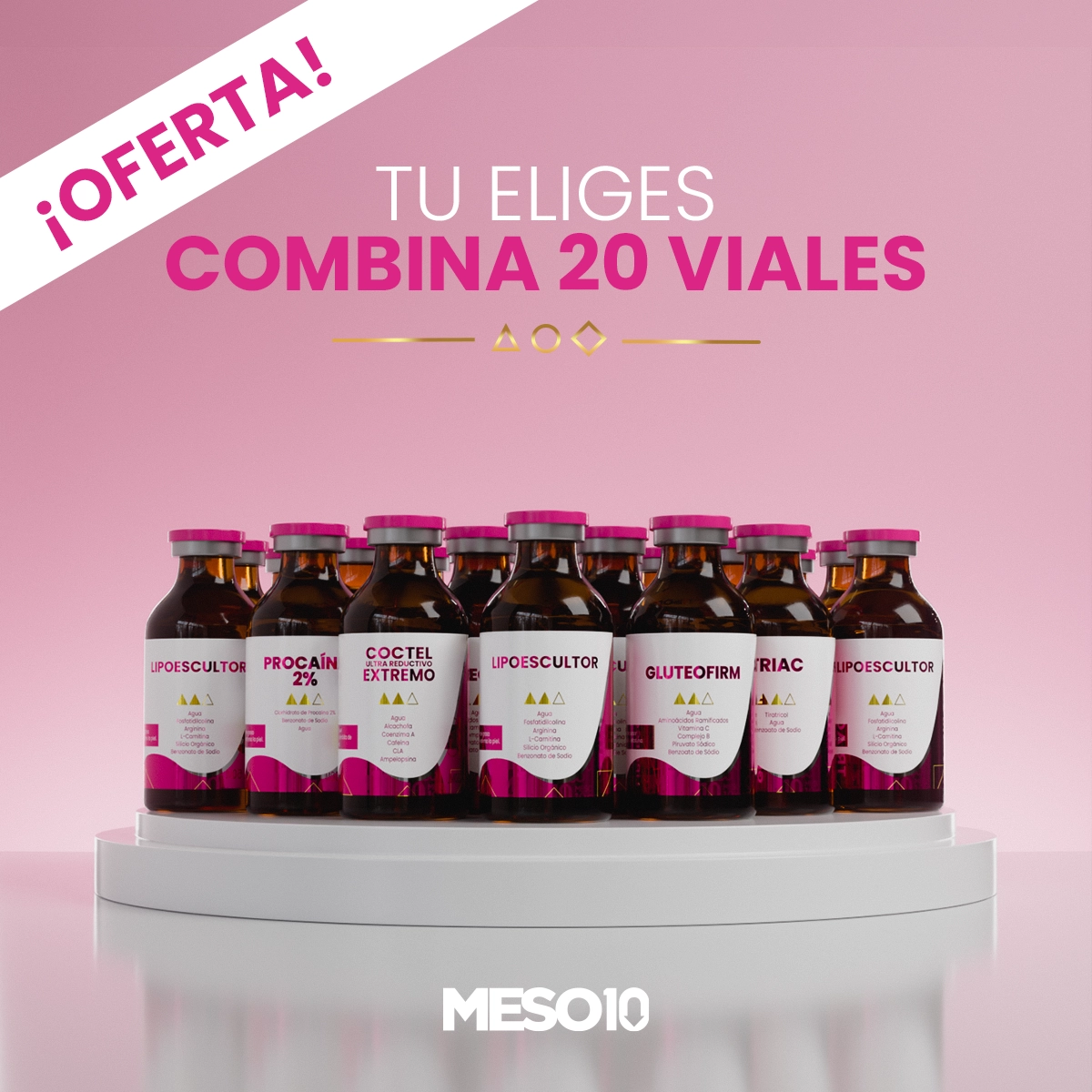 Dentro de esta promoción tú puedes llevarte hasta 20 sustancias diferentes en presentacion de frasco de 50 ml. De la marca meso10.