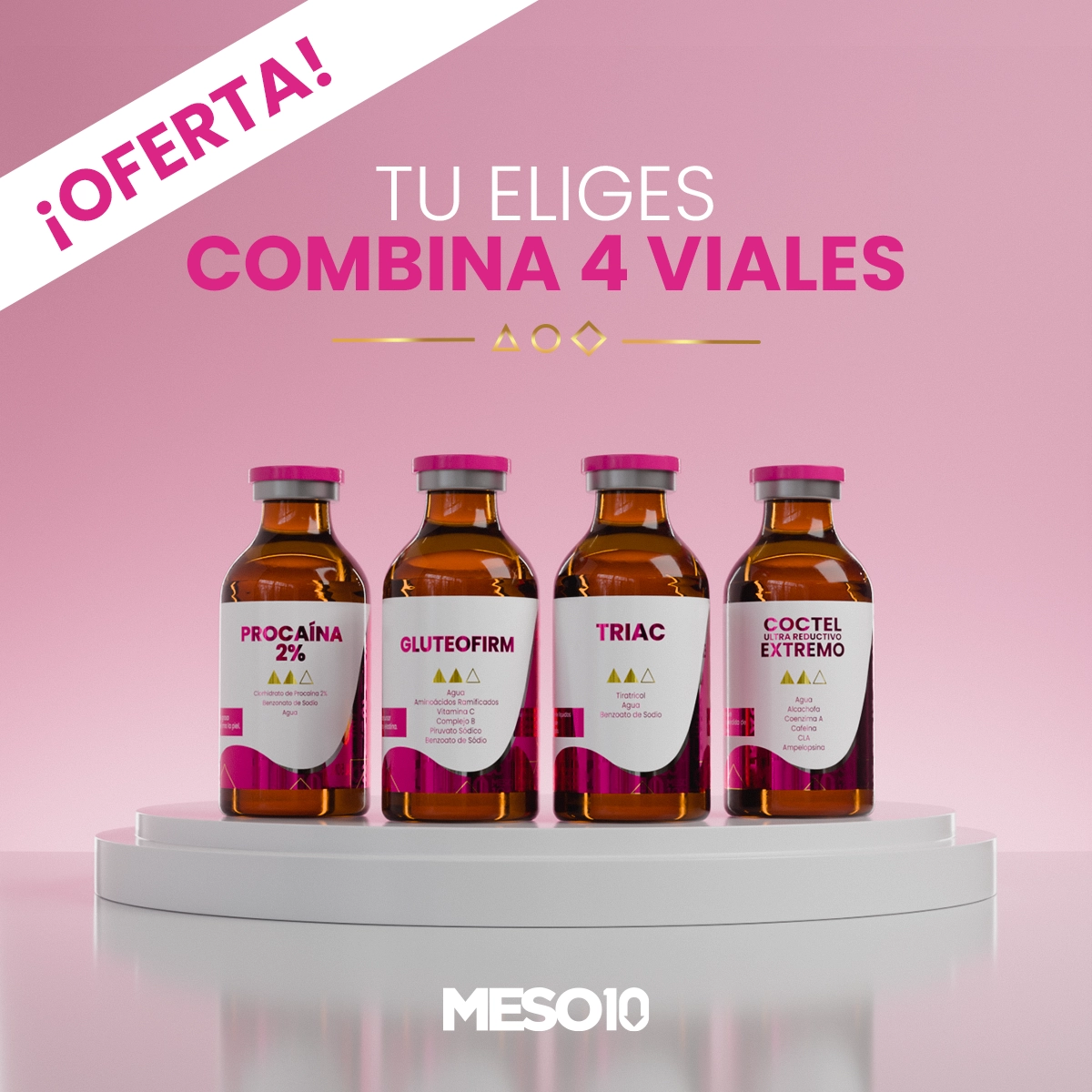 Dentro de esta promoción tú puedes llevarte hasta 4 sustancias diferentes en presentación de frasco de 50 ml. De la marca meso10.
